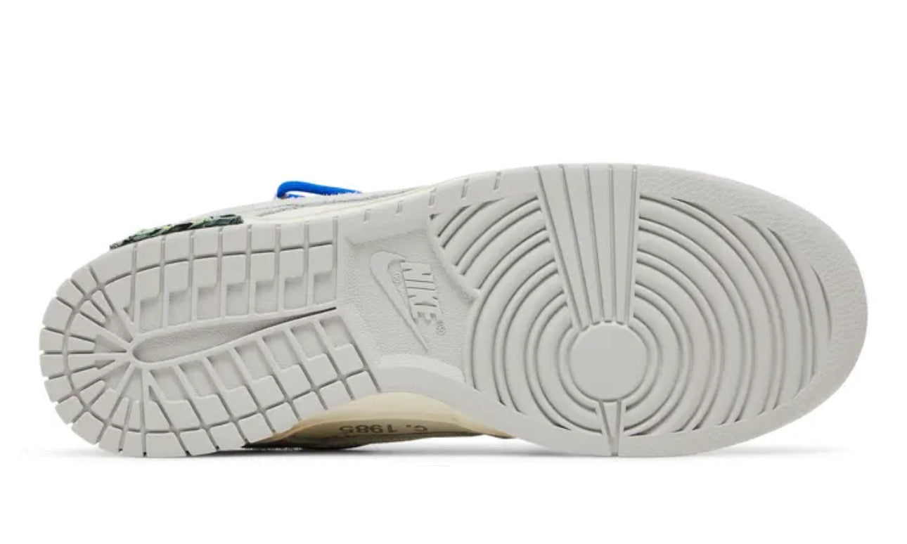 La collaborazione tra Nike e Off-White continua a dominare il panorama streetwear con l'uscita di 50 versioni di Dunk Low ridisegnate e colorate da Virgil Abloh. Il lotto numero 32 propone una sneaker con tomaia in pelle bianca con rinforzi in pelle scamosciata grigia. La midsole bianco panna presenta il dettaglio nero e menta che riporta la dicitura 32:50, mentre la outsole viene colorata di grigio. Swoosh in pelle scamosciata grigio chiaro con dettaglio verde accompagna dei lacci bianchi e dei lacci blu in stile outdoor, icona delle rivisitazioni Off-White delle Dunk Low. A completare la sneaker troviamo linguetta e ziptie grigi, logo Nike spostato in verticale sulla linguetta e scritta Nike ricamata sul tallone.