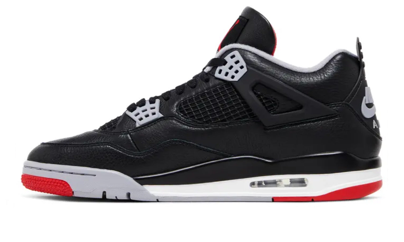 La Air Jordan 4 Retro "Bred Reimagined" ripropone l'iconica silhouette con una tomaia in pelle nera, sostituendo il nabuk del modello originale del 1989. I dettagli tradizionali includono la rete sul pannello laterale, gli occhielli sagomati grigi e il marchio Nike Air sulla linguetta del tallone. Sulla linguetta, un'etichetta Flight in tessuto mostra il logo Jumpman cremisi. La tomaia è montata su un'intersuola in poliuretano leggero, dotata di ammortizzazione Air-Sole incapsulata nell'avampiede e di un'unità Air a vista nel tallone. Sotto, una suola in gomma pre-invecchiata presenta un motivo di trazione a spina di pesce per un'aderenza superiore.