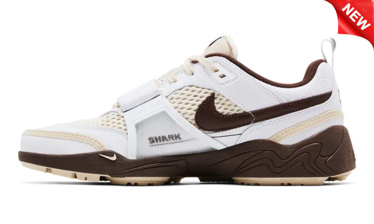 Le Travis Scott x Nike Zoom Field Jaxx "Light Chocolate" presentano una tomaia in mesh color crema con inserti in pelle bianca, fissati con una chiusura a lacci standard e un cinturino regolabile sull'arco plantare. Dettagli marroni caratterizzano l'iconico Swoosh, la fodera in tessuto del colletto e l'etichetta Nike sulla linguetta. L'ammortizzazione leggera è garantita da un'intersuola in schiuma marrone, decorata con linee ondulate che ricordano le Air Zoom Spiridon.